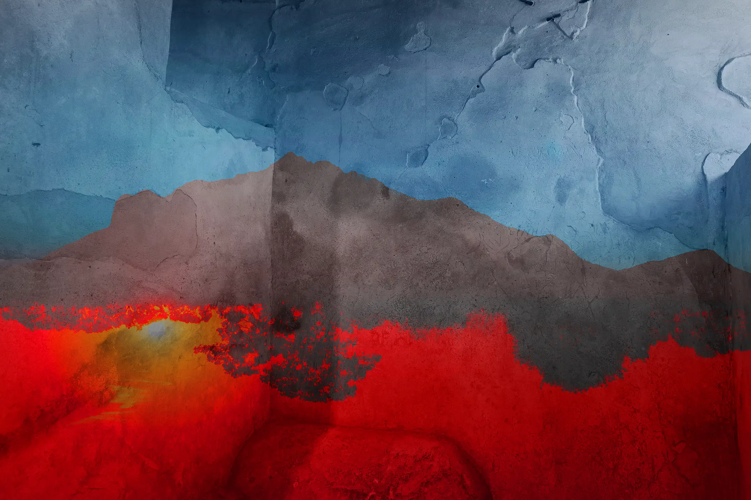The Other Side intersects the natural world with the recovered civilization of Pompeii in this abstraction. Spanning a period of 10 years, embedded within is an original wall from the brothels of Pompeii and etchings unknown (2013). The silhouette mountain is part of the range at Abraham Lake in Canada (2023). The red sunset burning into the horizon was imaged in the Canadian Prairies (2021).
